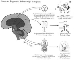 Dobbiamo fare un passo indietro e tornare per un attimo al funzionamento del cervello. Come abbiamo visto, nel corso dello sviluppo il cervello umano si è sovrapposto a quello dei mammiferi che a sua volta poggia su quello tipico dei rettili. Per il nervo vago si è verificata una sovrapposizione simile. Secondo la teoria polivagale di Porges il nervo vago è in realtà costituito da 2 branche: una la più antica, chiamata complesso dorsale del vago in comune con i rettili, la seconda complesso ventrale del vago che abbiamo in comune con tutti i mammiferi, ma che nell’uomo ha acquisito ulteriori funzioni più sofisticate Vediamoli: