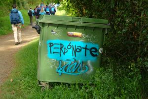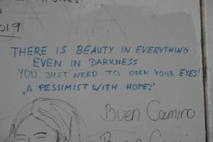 Certamente alcune di queste erano del peggior repertorio dell “urban style”, non tanto perché violente o volgari quanto perché tese solo a lasciare una traccia grafica inutile della propria presenza. Molte altre, però, mi sono sembrate un rimando a scoperte personali, non so se indotte dal Camino, o a inviti ad una riflessione profonda; a volte suggerimenti o domande lasciate aperte. Quasi “messaggi in bottiglia” lasciati a chi viene dopo per far riflettere, sostenere, o comunicare una propria scoperta.