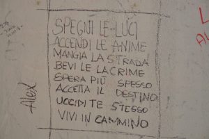 In altre ancora l’invito pressante “Perdonati”, seguito, dopo pochi chilometri da un’altra “Nessun inferno sopra di noi, solo il cielo”. Quasi a voler ricordare che in genere il nostro peggior carnefice siamo noi stessi, sempre così pronti a massacrarci, senza darci quasi mai una possibilità di riscatto.
