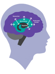 Nella parte più antica e profonda troviamo le stesse strutture dei pesci, dei serpenti, e degli altri rettili come le lucertole. E’ il cosiddetto cervello rettiliano deputato alla gestione di comportamenti stabiliti geneticamente. Rientrano in questa categoria importanti fenomeni come la sopravvivenza, la respirazione, il sonno, la frequenza cardiaca e la riproduzione. A questi possiamo aggiungere alcuni iniziali aspetti sociali come la territorialità, la dominanza, e comportamenti rituali. Sono strutture cerebrali che potremmo definire, “autocentrate”, nel senso che guardano solo ai propri interessi basici. Queste aree utilizzano i contrasti come “con/senza”, “prima/dopo” etc, considera solo quanto è familiare, e basa il suo funzionamento sulle informazioni visive che sono processate senza l’intervento di strutture cerebrali “superiori”. E’ interessante notare che i messaggi pubblicitari hanno come obiettivo quello di andare a influenzare proprio questa parte del cervello, tanto che esiste un’area di studio definita “neuromarketing” e che cerca di utilizzare studi sul cervello rettiliano per mettere in campo campagne pubblicitarie sempre più efficaci. Si ricordi, infatti, che oltre 85% delle nostre decisioni di acquisto sono inconsce e trovano il loro “perché” in quest’area.